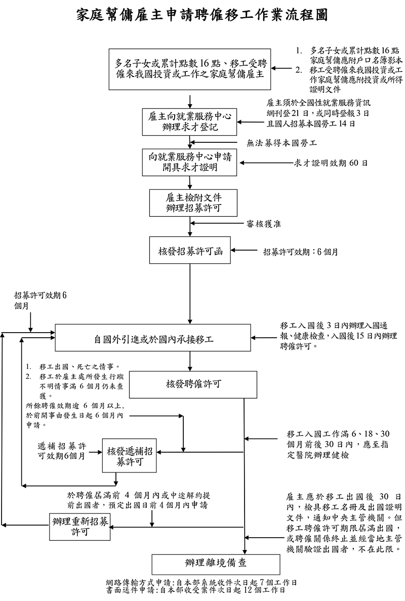 服務介紹 外國人事業 家庭女傭申請 家庭女傭申請 定義在私人家庭從事房舍清理、食物烹調、家庭成員起居照料或其他與家事服務有關工作。 申請資格 家戶成員符合以下條件之一: 有3名以上之年齡6歲以下子女。 有4名以上之年齡12歲以下子女,且其中2名為年齡6歲以下。 依下表計算家戶成員,累計點數滿16點者。雇主聘僱家庭幫傭工作者,1戶以聘僱1人為限。 累計點數人員之年齡 點數 累計點數人員之年齡 點數 年齡未滿1歲 7.5 點 年齡滿75歲至未滿76歲 1點 年齡滿1歲至未滿2歲 6 點 年齡滿76歲至未滿77歲 2點 年齡滿2歲至未滿3歲 4.5 點 年齡滿77歲至未滿78歲 3點 年齡滿3歲至未滿4歲 3 點 年齡滿78歲至未滿79歲 4點 年齡滿4歲至未滿5歲 2 點 年齡滿79歲至未滿80歲 5點 年齡滿5歲至未滿6歲 1 點 年齡滿80歲至未滿90歲 6點 年齡滿6歲至未滿75歲 不計點 年齡滿90歲以上 7點 註:幫傭點數之計算:第3項累計點數之計算,以雇主未滿6歲之子女、年滿75歲以上之直系血親尊親屬或繼父母、配偶之父母或繼父母之年齡不同計算。但與雇主不同戶籍、或已申請家庭看護工或已列計為申請家庭幫傭之人員者,其點數不予列計。 申請文件 雇主國民身分證正反面影本、雇主及受照顧者之戶口名簿或戶籍謄本影本。(需同一戶籍) 申請人私章一枚。 外國人工作期滿前四個月可辦重新招募 流程圖解析 返回