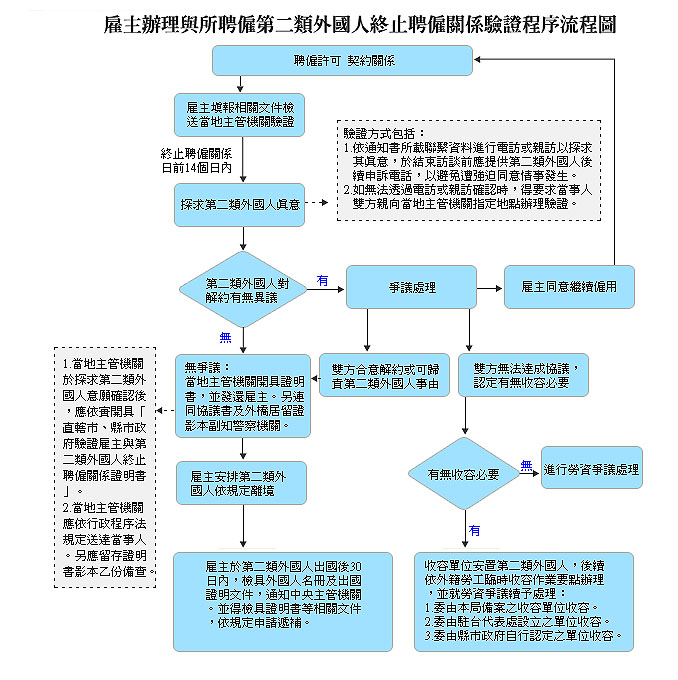 服務介紹 聘僱錦囊 離境返鄉 離境返鄉 期滿解約離境 應辦事項: 確定離境日期:備妥外傭之護照及居留證,請求本公司協助代訂回鄉機票及相關事宜。 辦理完稅:雇主應將外傭之護照交由本公司至稅務機關辦理外傭之完稅證明。 結算薪資:雇主應備妥薪資表,在本公司之見證下與外傭結清薪資,待外傭確認無誤,並簽立切結書後,將其放入薪資袋中封起,交由本公司送機人員。 注意事項: 確定離境日期:備妥外傭之護照及居留證,請求本公司協助代訂回鄉機票及相關事宜。 辦理完稅:雇主應將外傭之護照交由本公司至稅務機關辦理外傭之完稅證明。 結算薪資:雇主應備妥薪資表,在本公司之見證下與外傭結清薪資,待外傭確認無誤,並簽立切結書後,將其放入薪資袋中封起,交由本公司送機人員。 不適任解約遣返 解約前的考慮事項: 給予外傭最後機會:僱主可嘗試再給予外傭2週的觀察期、安排本公司進行入境再訓練課程或進行溝通輔導,若外傭的表現仍沒有改善,便可考慮解僱,重新另聘一名外傭。 空窗期:如果僱主解僱外傭,另聘一名外傭,由申請至新女傭入境,需約8至12週的時間,因此,僱主需考慮在解傭女傭後的家事安排。 如果僱主無法等待空窗期,則可先行辦理解約重招,待新外傭確定入境日期後,才解僱原有外傭,惟僱主在辦理期間應注意不得讓外傭知道,以免發生逃逸情勢。 不適任之認定: 拒絕僱主合理之命令、指示與督導。 工作不勤奮。 詐欺。 行為不檢。 無正當理由拒絕工作。 受僱期間結婚。 在外從事兼職工作。 偷竊或非法佔有僱主物品。 捏打雇主之小孩。 體檢不合格。 其他相關規定: 外傭因故遭遣返離境,其相關衍生之費用(如機票款等)由外傭自行負擔。 外傭遭遣返後,需向勞動部辦理遞補手續,一般而言,雇主需等待約10至12週左右。